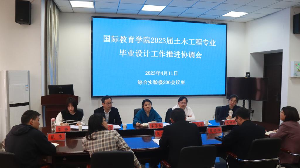 为确保2023届土木工程专业(中外合作办学)本科毕业设计的顺利完成, 4月11日下午,在综合实验楼206会议室,建工学院与国际教育学院联合召开2023届土木工程专业(中外合作办学)毕业设计推进会。国际教育学院院长李保红、副院长姚光金、副书记付春锋、教学秘书朱妍妍、2023届土木工程专业(中外合作办学)班主任陈璐;建工学院院长周葆春、副院长袁晓辉、土木系主任高春华、教学秘书李卉、毕业设计指导教师代表张伟参会。