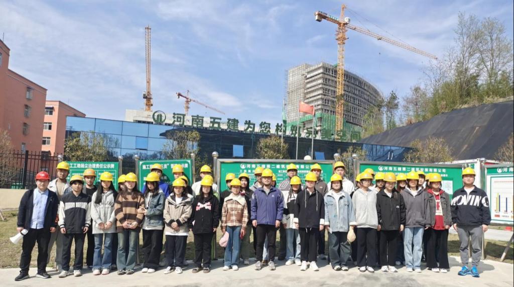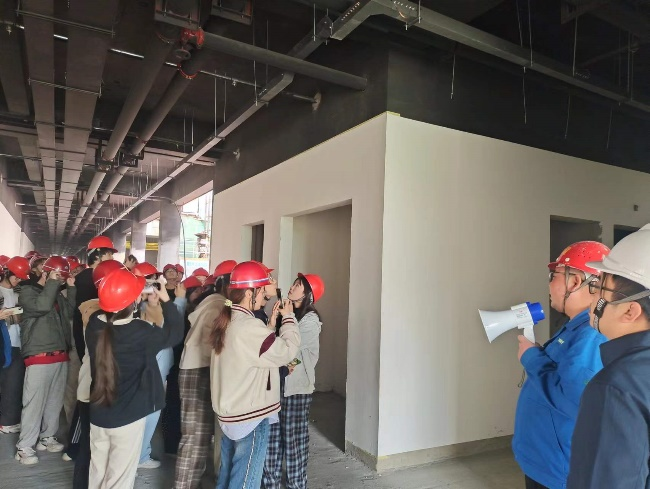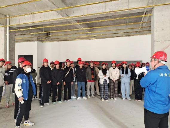 工程管理专业师生的到来表示热烈的欢迎,并对实习过程中的安全注意事项做了介绍和要求。随后,现场技术负责人向同学们介绍了实验科研综合楼的工程概况以及目前的施工进度。结合现场的施工情况,详细讲解了室外玻璃幕墙的安装、超过24米脚手架搭设方案的论证、弧形梁的放样以及现场新材料的性能等内容。并带领同学们参观了装修样板间,详细介绍了墙面抹灰工序流程、地面装修的注意事项、天花板龙骨的间距以及卫生间的闭水试验等相关专业知识。