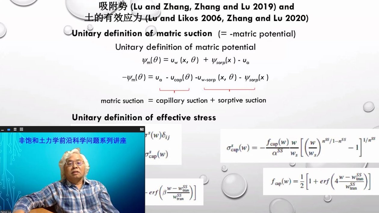 邀请,美国科罗拉多矿业大学Ning Lu(卢宁)教授开设的18讲“非饱和土力学前沿科学问题系列云讲座”落幕,该系列讲座聚焦于非饱和土力学前沿领域,围绕土的吸附势(Soil sorptive potential)与土的有效应力(Soil effective stress)2大主题,18讲内容分别为: