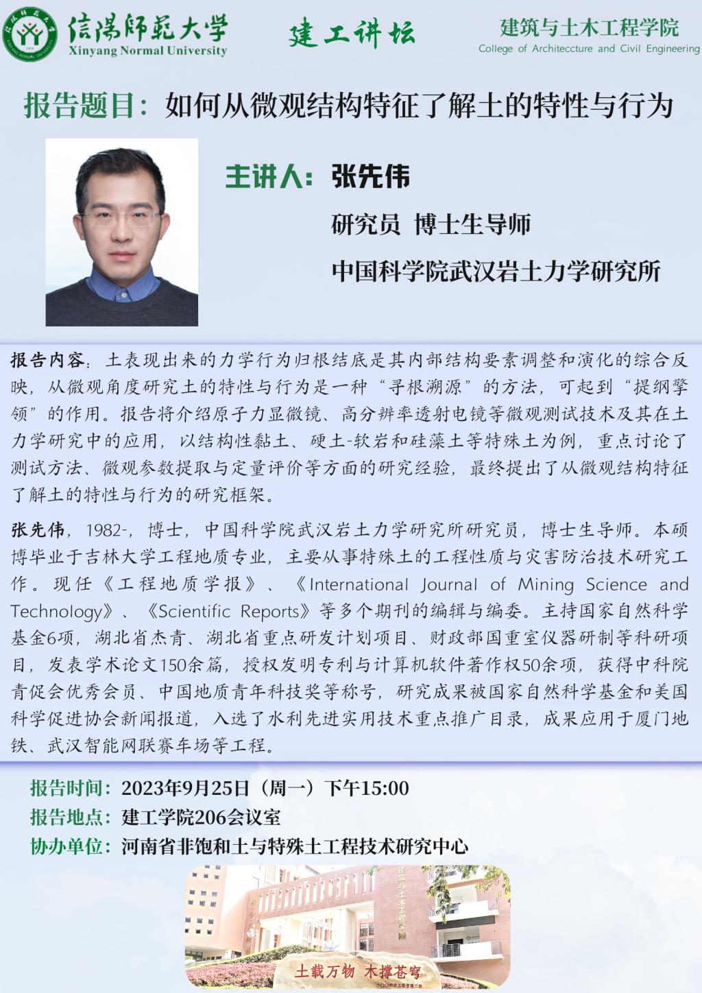 报告人简介:张先伟(1982-),博士,中国科学院武汉岩土力学研究所研究员,博士生导师。本硕博毕业于吉林大学工程地质专业,主要从事特殊土的工程性质与灾害防治技术研究工作。现任《工程地质学报》、《International Journal of Mining Science and Technology》、《Scientific Reports》等多个期刊的编辑与编委。主持国家自然科学基金6项,湖北省杰青、湖北省重点研发计划项目、财政部国重室仪器研制等科研项目,发表学术论文150余篇,授权发明专利与计算机软件著作权50余项,获得中科院青促会优秀会员、中国地质青年科技奖等称号,研究成果被国家自然科学基金和美国科学促进协会新闻报道,入选了水利先进实用技术重点推广目录,成果应用于厦门地铁、武汉智能网联赛车场等工程。