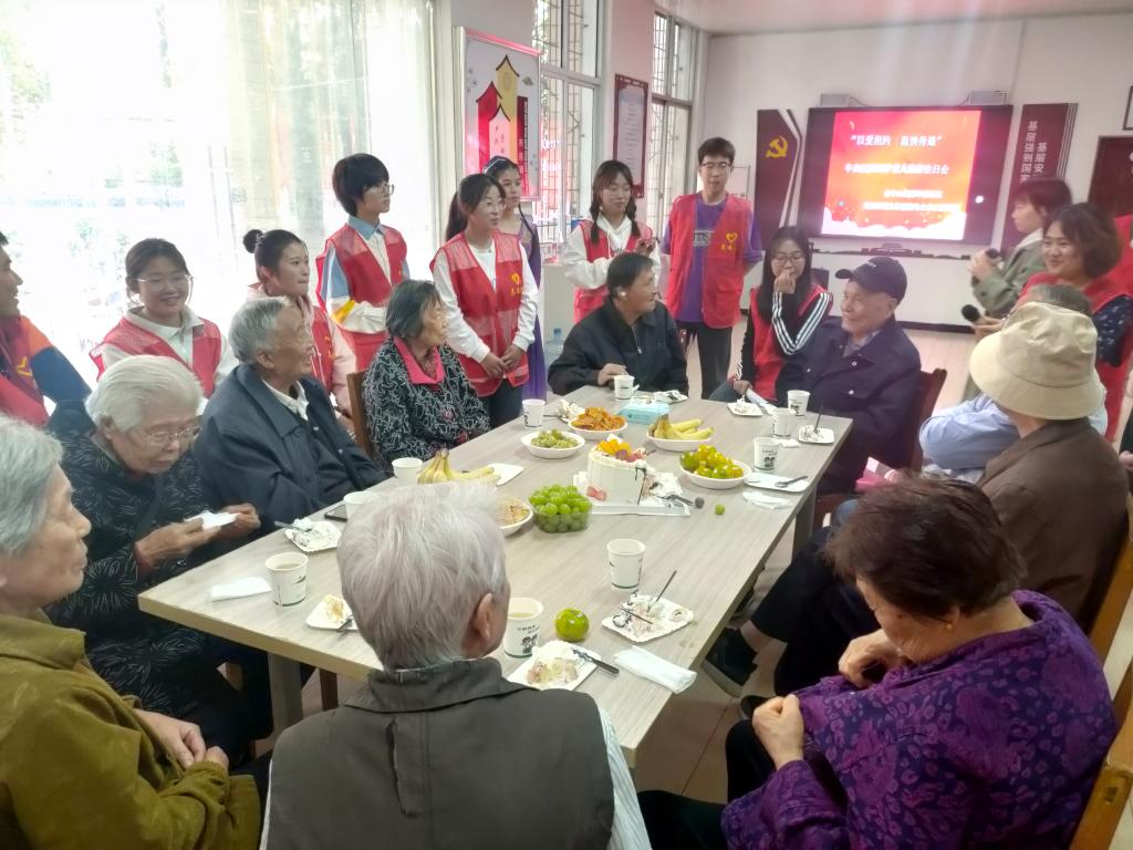 学院党员们提前准备了生日蛋糕、水果和零食,社区工作人员布置了场地。集体生日会开始,大家一起为老人们唱生日歌,送上生日祝福。老人们边吃蛋糕、水果,边欣赏由学生党员们带来的表演。郭心茹、李依婷带来的歌曲《我和我的祖国》,燃起了全场热情,大家合唱,共同表达对伟大祖国的衷心依恋和真诚歌颂。麦合丽娅带来的维吾尔族舞蹈极具民族特色,在场人员纷纷拍手叫好。还有白浩仪和杨琦的歌曲《精忠报国》,郑艺冉、豆佩瑄朗诵的《变老的时候》,黎哲带来的朗诵《将进酒》都得到了老人们的喜爱。