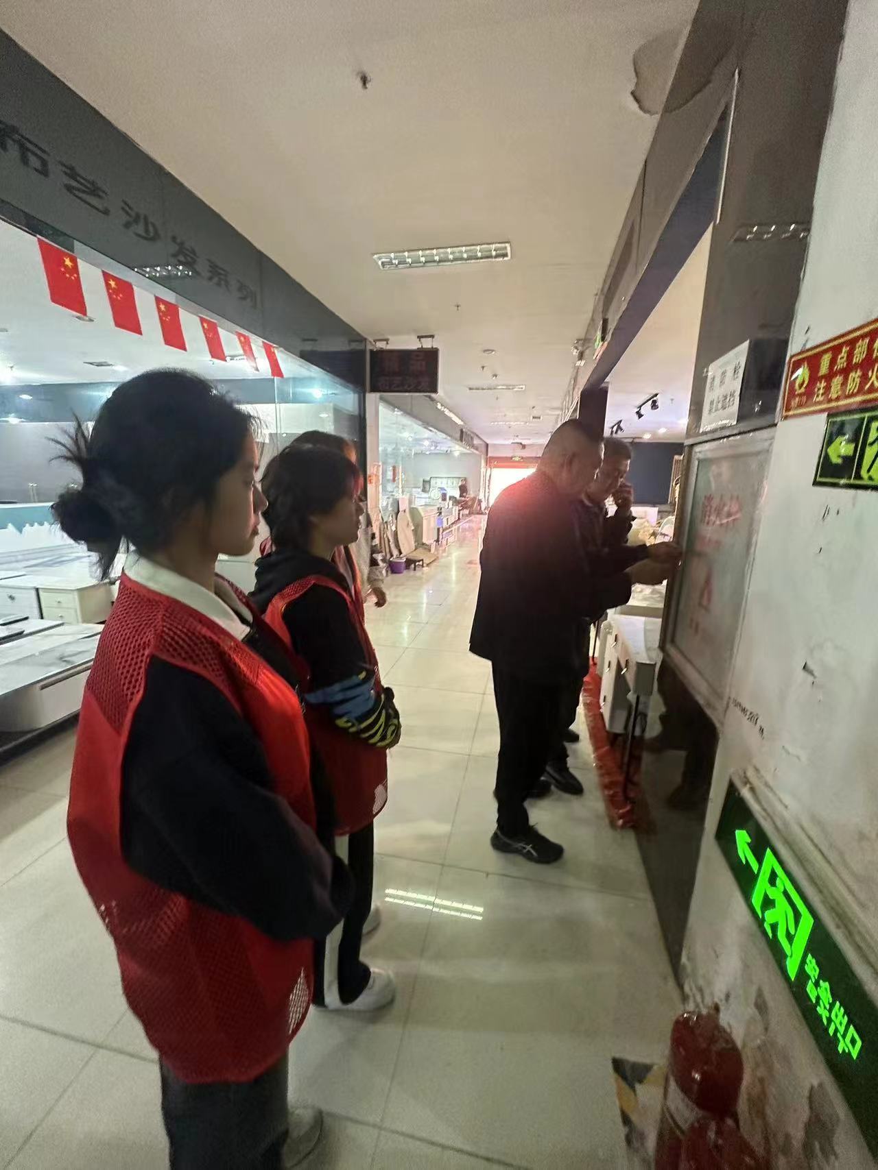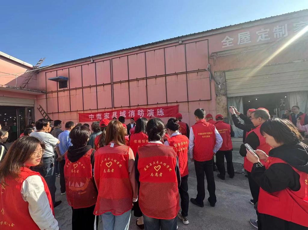 学生党员代表与浉河区金牛山街道华森社区党支部党员在中南家具城联合开展消防演练活动。