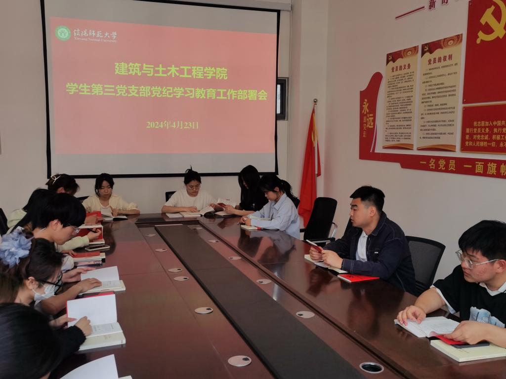 学生第三党支部将始终坚持以习近平新时代中国特色社会主义思想为指导,认真学习贯彻习近平总书记关于党纪学习教育的重要指示精神,以读书班、微党课等形式,组织党员认真学习《中国共产党纪律处分条例》,搞清楚党的纪律规矩是什么,弄明白能干什么、不能干什么,把遵规守纪刻印在心,内化为日常言行准则习惯。