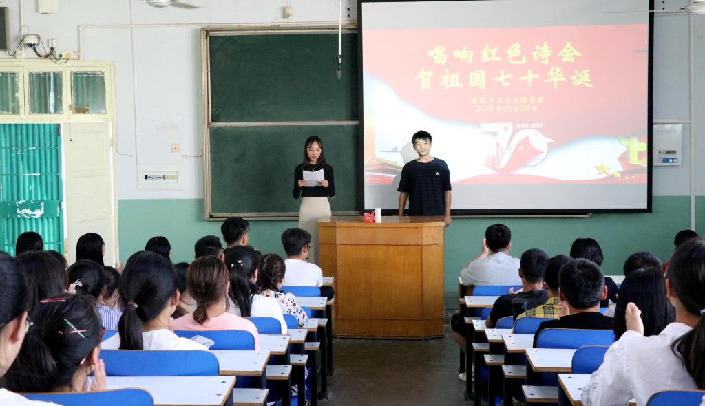 于9月29日晚在综合实验楼405教师开展了“唱响红色主旋律,庆祝祖国70华诞”主题诗会活动。学院党委副书记方明科、团委书记张晓博、学生党员代表等70余人参加了本次活动。