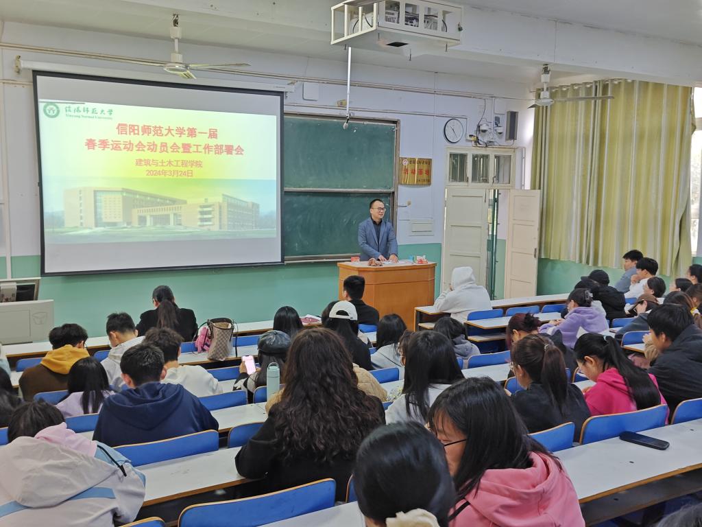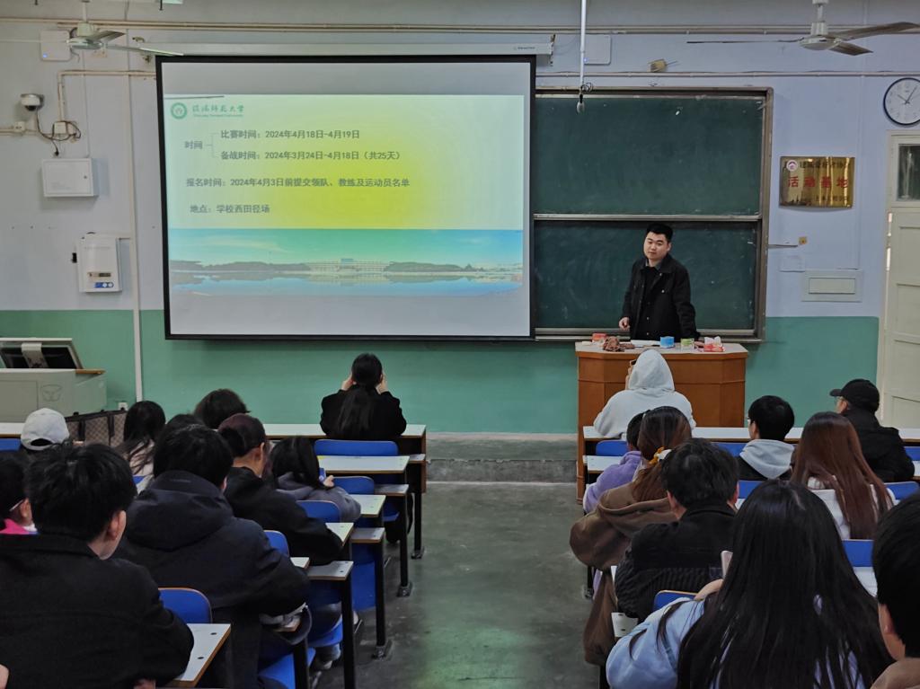第一届春季运动会动员会,学院党委副书记冀鹏,团委老师冯舒心,学院各班级学生代表参加会议。