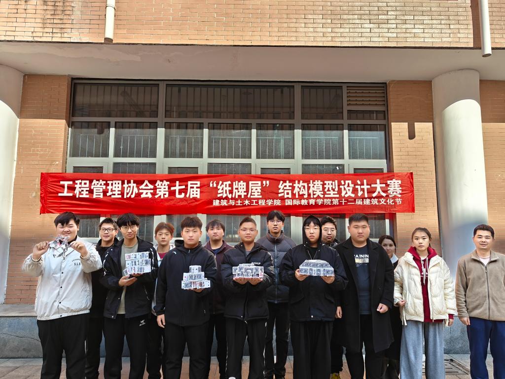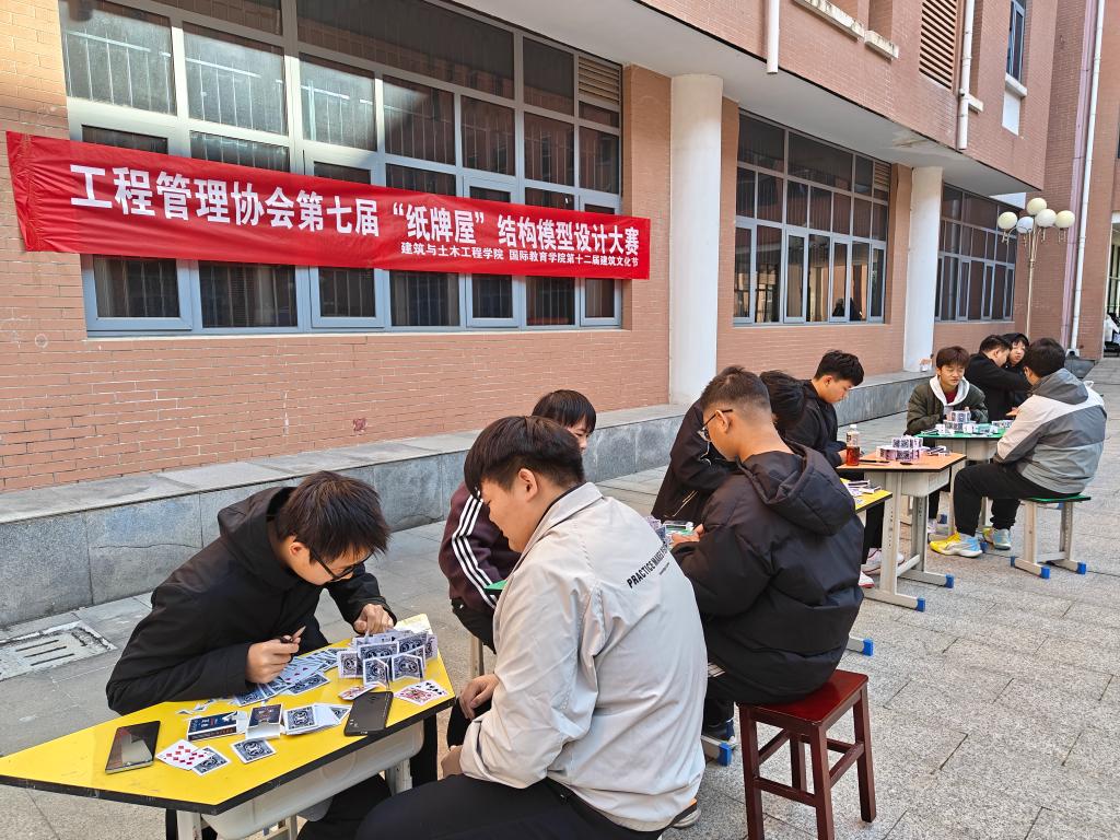 在综合实验楼小广场举办第七届“纸牌屋”结构模型设计大赛。工程管理协会指导老师吴志强、社团部分学生以及参赛选手参加活动。