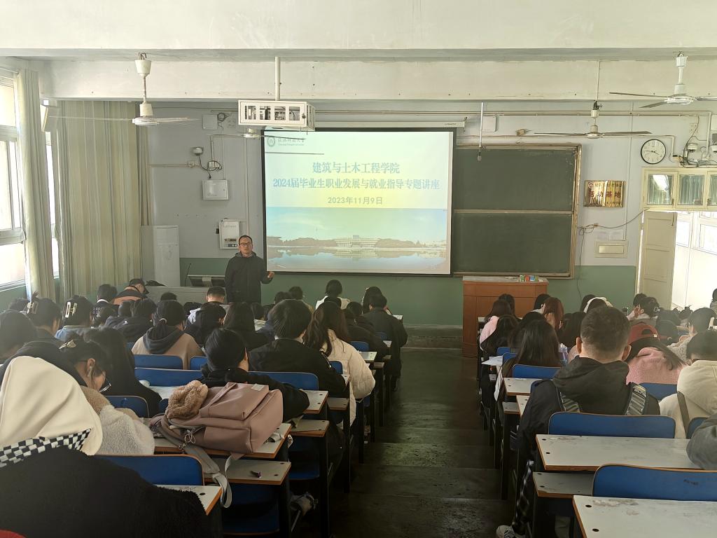 冀鹏首先带领大家分析了建筑和房地产行业发展现状和2024届毕业生就业去向落实的最新情况,对大家就业路径和职业规划提出了指导建议。他指出,本学期毕业生们都在校上课,面临着备战考研和就业等多重压力,大家要调整好心态,做好个人规划,在确保毕业各项工作有条不紊向前推进的同时,要提前做好就业准备。一是要认真学习专业知识,不断提升专业技能;二是要积极参加专业实习实践,充分积累实践经验;三是要积极考取资质证书,努力做到“持证上岗”;四是不断提高人际交往与沟通能力,着力构建良好的人际关系。他最后指出,目前就业形势比较严峻,大家树立正确的就业择业观念,坚持“先就业后择业”。同时,要积极行动起来,不仅要主动参加学院举办的专场招聘会和学校的双选会,还要通过国家24365大学生就业服务平台和学校招聘网站积极关注就业信息。他最后指出,找工作不是一蹴而就的事,也需要多次尝试,希望各位同学通过自己的努力,顺利找到自己理想的一份工作。