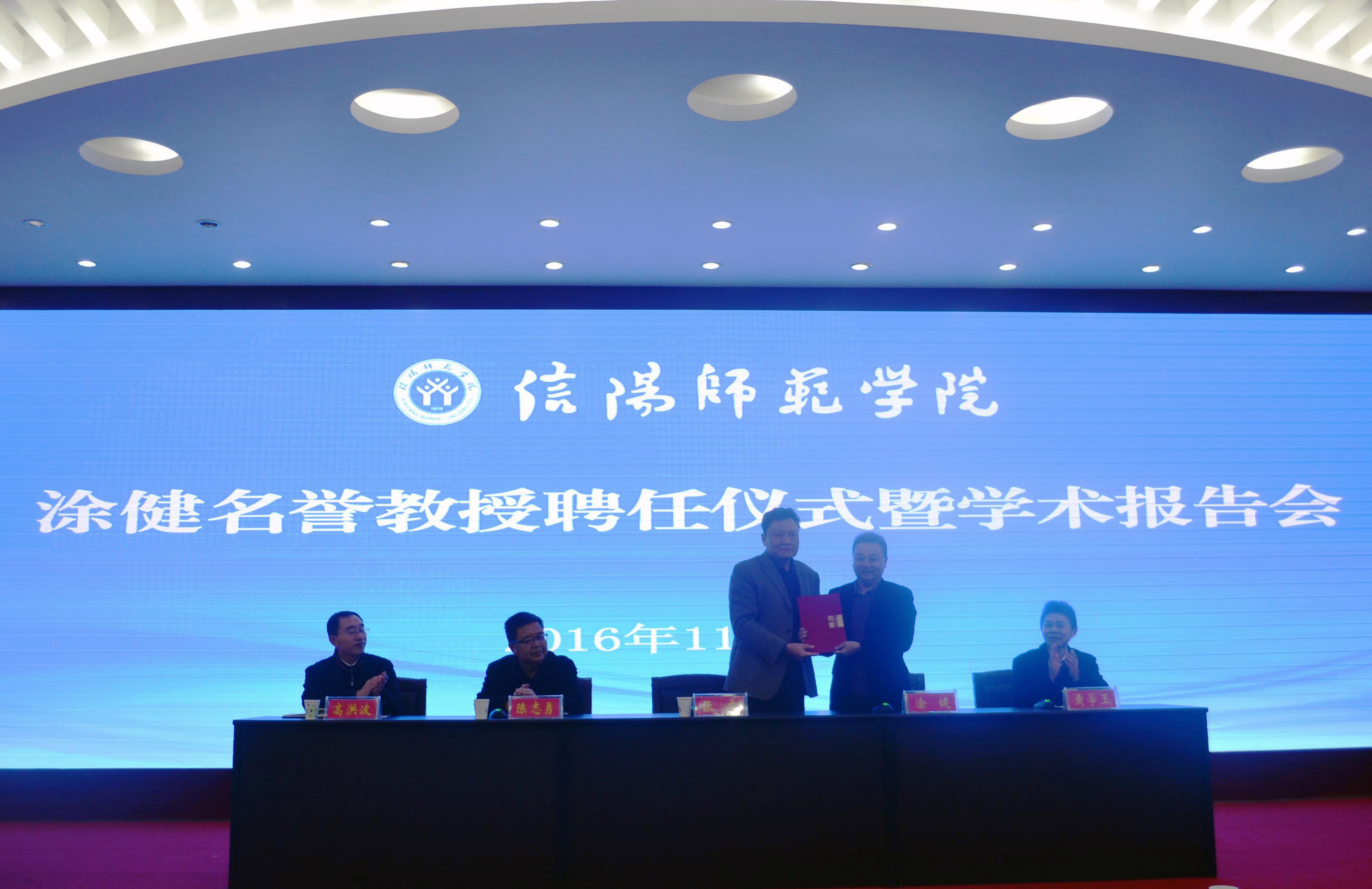 聘任仪式上,张力代表学校为涂健颁发了信阳师范学院名誉教授的聘书。