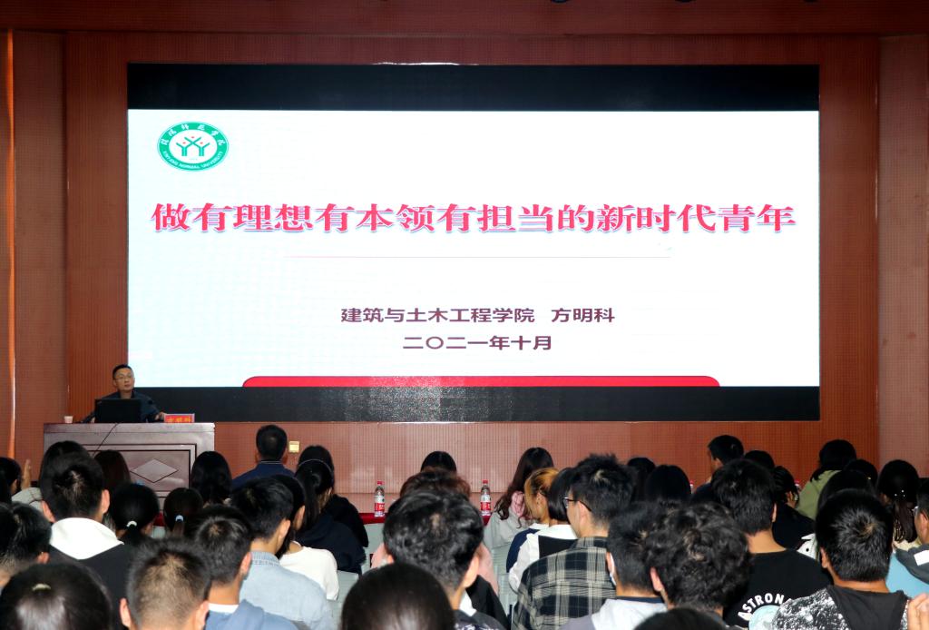 方明科做了题为《做有理想、有本领、有担当的新时代青年》的主题报告。他首先围绕校园环境、学科建设、科研创新、优秀校友等方面的内容向同学们介绍了学校、学院的基本情况。并鼓励新同学树立爱校护校意识,尽早融入大学的学习、生活。接着,他带领同学们深入学习了习近平总书记“七一讲话”重要精神,并提出学习七一讲话精神,就是要深入学习中国共产党的百年奋斗史,明白我们要走什么样的道路,了解我们目前的优势所在和存在的差距,增强四个自信,坚持两个维护,积极响应党的号召。要谨记总书记的殷切嘱托,争做有理想、有本领、有担当的新时代、新青年,为实现中华民族伟大复兴,建设富强民主的现代化社会主义国家贡献自己的青春热血的目标要求。最后,他以“有理想”、“有本领”、“有担当”为关键词,结合自身学习、工作经历,告诉同学们,要及早树立远大的理想目标,不断追求进步,努力实现自己的人生价值,把青春梦融入到中国梦里去;要修炼品性、坚定信念、勤学善思、知行合一,努力去学习、奋斗,笃行实干,争做先锋;要勇于担当,争做时代的弄潮儿,专业无好坏,职业无贵贱,在大学期间努力学习,全面发展,力争度过一个充实、美好、值得回忆的大学生活。